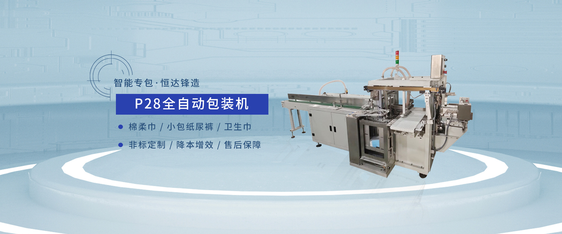 P28包裝機是主要用于衛(wèi)生巾、嬰兒紙尿褲(小包)、嬰兒護理墊、棉柔巾等裝袋封口的全自動包裝機。